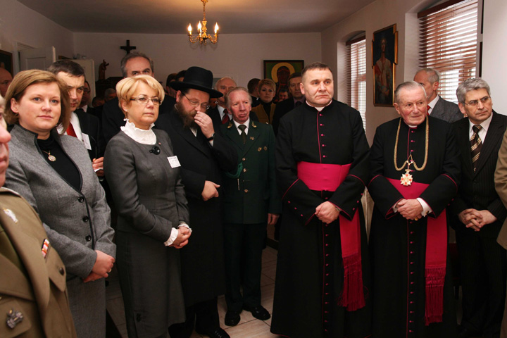 People in their individual fates preserved in photographs, the faces of Jews killed in the Holocaust, are shown in the Shalom Foundation’s exhibition And I Still See their Faces, which was exhibited in Sieradz during the 2009 Day of Judaism. This was the thirty-fourth city in the world and the seventh in Poland where the photos were shown. The words of Shalom Foundation director Gołda Tencer, who attended the opening at the Catholic House in Sieradz, illustrate how close the exhibition comes to Father Bronikowski’s ideas. “There are cases where the only thing left from a person’s whole life is a moment captured in a photograph. This applies to individuals. What can we say when the outlines of figures, the shadows of houses, and long-vanished smiles are all that remain of a people who numbered in the millions?”